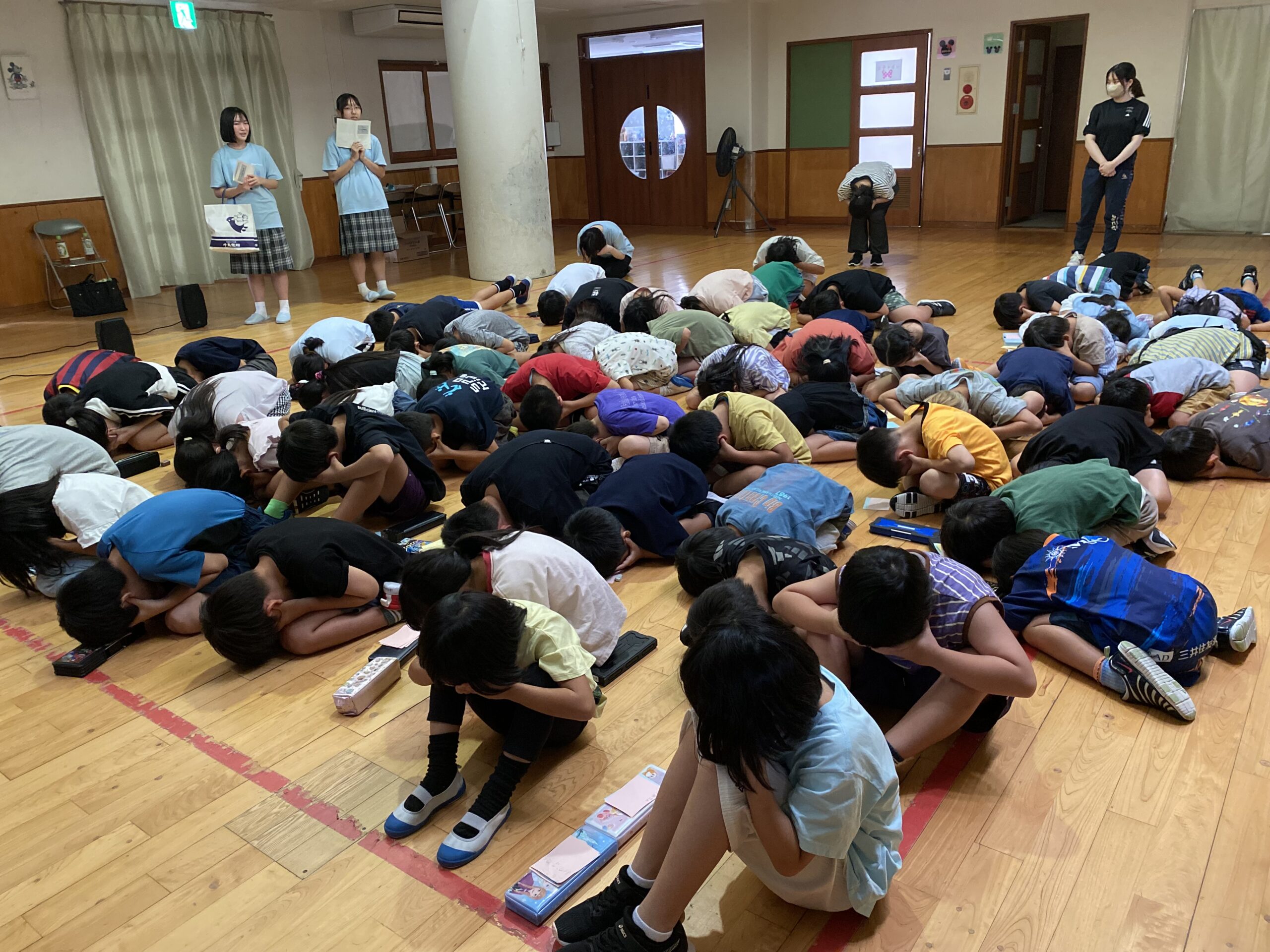 防空壕での態勢を習いました。